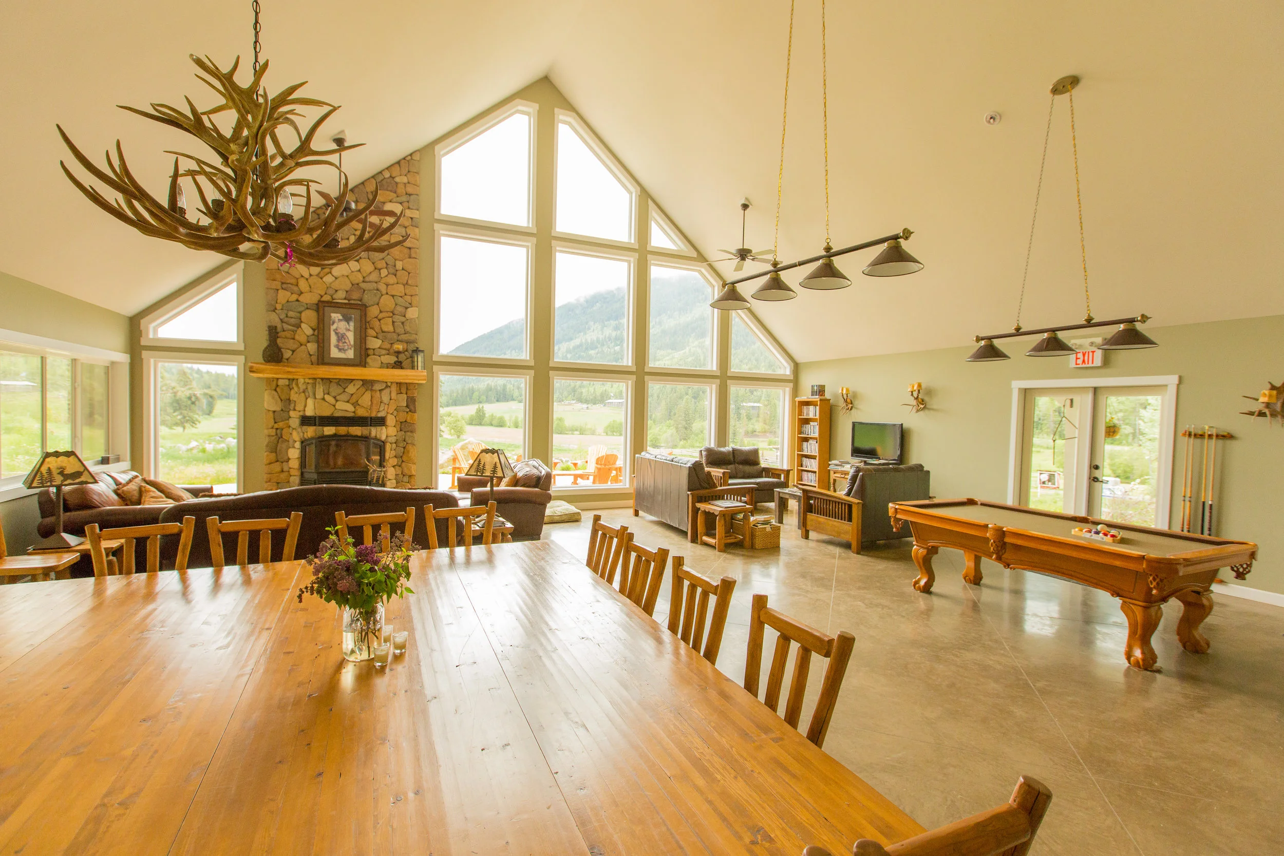 Built in 2009, the main lodge features a commercial catering kitchen, 20 seat custom wood dining table, beautiful outdoor patio, billiards, free Wi-Fi, comfy leather couches and a wood-burning fireplace.